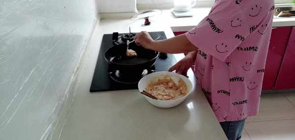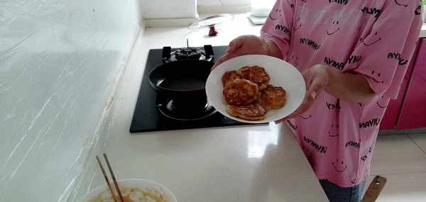 4.開小火,鍋裡放油,把剛剛攪拌好的土豆泥用小湯勺小心地盛到鍋裡煎制,然後小火慢煎,慢慢地煎至2面金黃,美味的土豆餅就可以開吃啦!