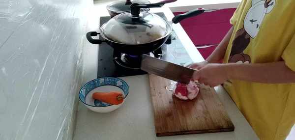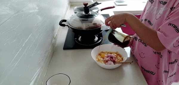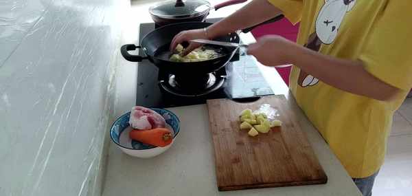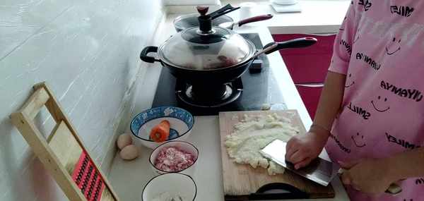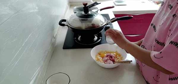 2.先把土豆切成小塊放在鍋裡加入清水蓋上鍋蓋大火煮至軟糯,然後把肉剁成肉餡裝碗備用。