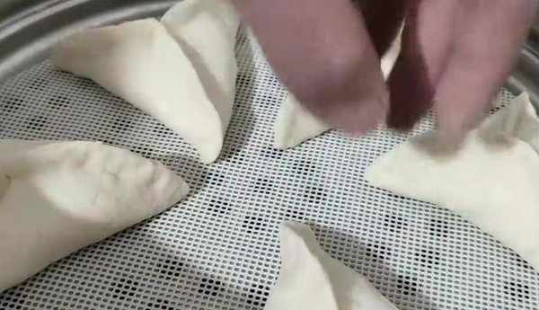 添加少許熟黑芝麻,再次攪拌均勻,面團已經發酵好瞭,揉面、排氣,揉好之後取出面團整理成長條狀面劑,弄好之後分成多個等大小的小劑子,將每個小劑子按扁,搟成包子皮,取包子皮放入調好的白糖餡料,捏成這樣的三角形就可以瞭。一次弄好所有的糖包,冷水上鍋。