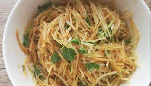 將土豆絲放到清水裡面浸泡一會,多清洗幾遍,去除淀粉,吃起來更脆爽。鍋中放入適量的清水燒開,放入洗好的土豆絲,焯燙一下,撈出來控水。將控好水的土豆絲放到碗中,加入香菜、蔥花、花椒油、鹽、生抽、醋和蠔油,攪拌均勻。
