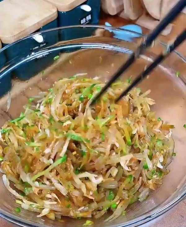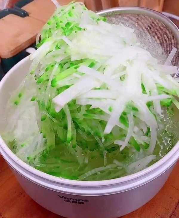 第三步:調餡。這個餡兒也特別簡單,準備好的白蘿卜、綠蘿卜切絲,放入盆中。