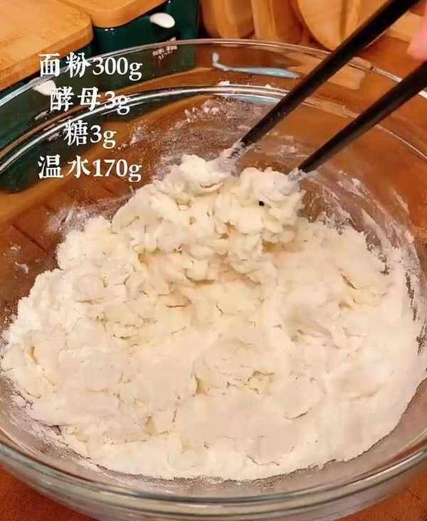 第一步:把準備好的300克面粉,3克酵母,3克糖,170克溫水,都倒入大盆中,拌成絮狀。
