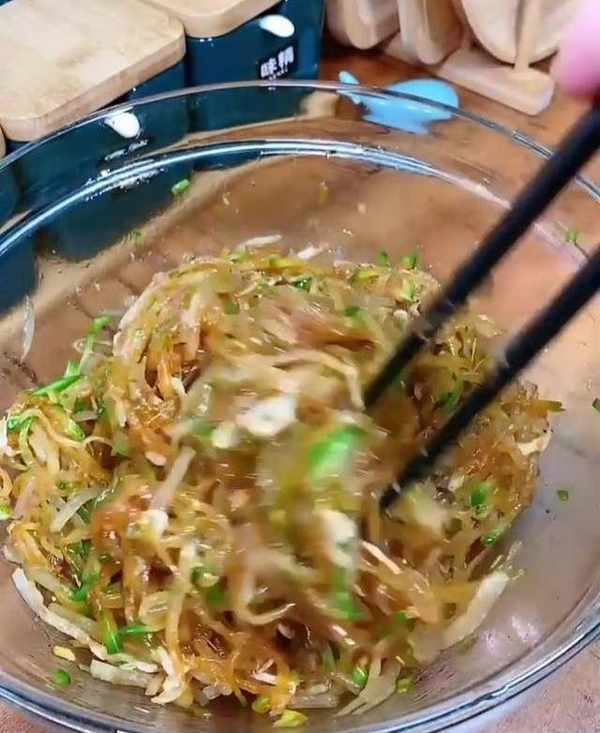 第六步:調好的包子餡攪拌均勻,餡兒就調好瞭。