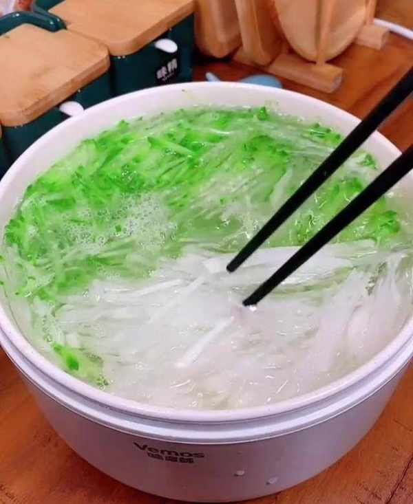第四步:把蘿卜絲開水下鍋焯水一分鐘,撈出過涼水晾幹水分切斷。