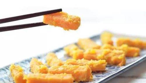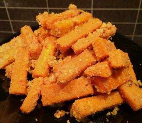 第七步:然後將炸好的南瓜條撈出來晾幹。最後再用大火燒開油,將南瓜條再炸一次,炸至表面焦黃變硬就可以瞭。