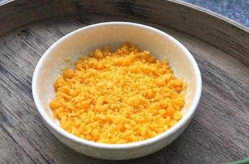 第八步:將蒸好的咸鴨蛋黃碾壓成細碎末。
