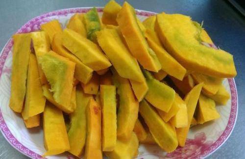 第二步:將南瓜去皮切成均勻大小的長條狀。