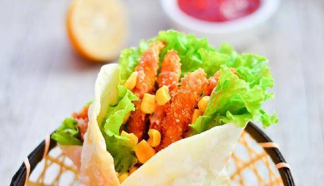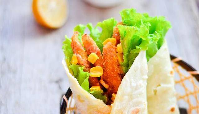 12:取一個卷餅放上幾片生菜,擠些千島醬,放上雞柳,玉米粒,一卷,再用牙簽固定下。