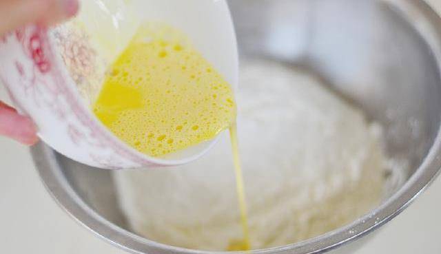 4:水分次加入面粉裡攪拌均勻。