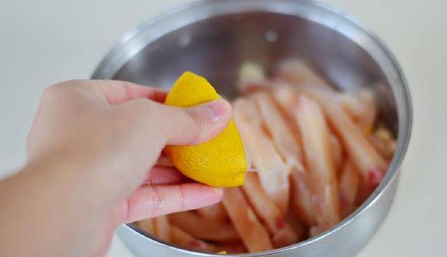 3:檸檬汁擠入雞柳裡。