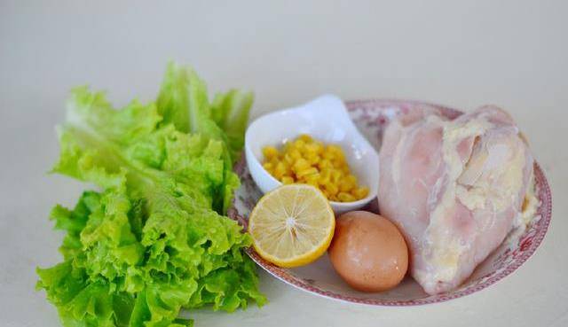 雞胸肉450g,面包糠300g,面粉80g,生菜適量,雞蛋2個,檸檬半個,玉米粒15g