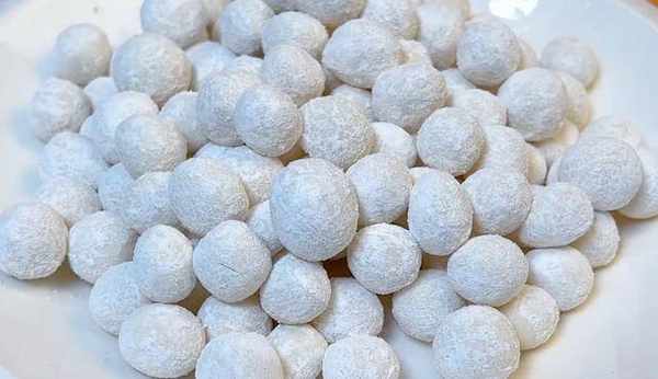 過程比較漫長,如果改時間的朋友可以直接在面板上搓成小圓球,全部搓好以後把它裝入盤中。鍋中水提前燒開,然後把湯圓放入鍋中,用鏟子攪拌一下,防止粘連在一起,開大火煮,往裡邊加入小半碗涼水,進行點水,繼續用鏟子攪拌均勻,開大火燒開。燒開後煮著湯圓全部漂浮起來,並且微微變色,像這樣說明就已經熟瞭。然後用漏勺控水撈出,給他放入冰水中迅速過涼,就這樣給它放在冰水中泡著備用,這樣吃著會更加的勁道有嚼勁。