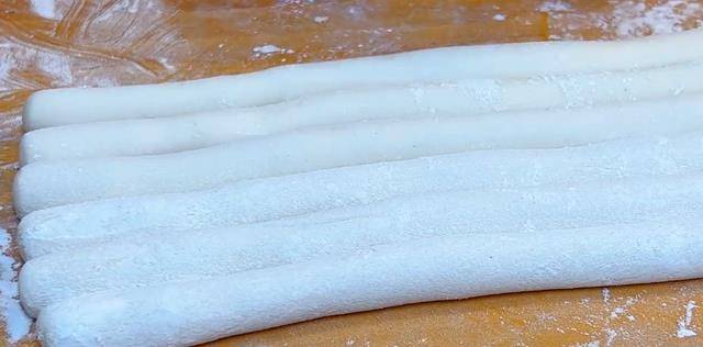然後取一個面劑給他揉一揉,把表面揉光滑,揉光滑後再給它搓成長條,搓成和小拇指一樣粗的長條就可以。依次用同樣的方法把剩下的面積都揉完。全部搓完後,五到六根為一組,把他們平放到一起,然後用刀給它分成大小均勻的小面積。盡量切的均勻一些,也不用切的太大瞭,全部切好後,再撒上一層糯米粉,用手抖散開,防止粘連在一起。抖散開後,戴上手套,取一個面劑,用手給他搓成小圓球,盡量搓得圓一些,像這樣一個小湯圓生胚就做好瞭這個。