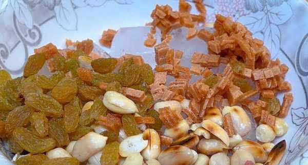 現在我們的花生已經半涼瞭,再把花生皮去掉,用手像這樣一搓就掉瞭,非常的簡單。花生去皮後再倒入漏勺中,用漏勺過濾一下,像這樣篩一篩,把花生皮過濾出去,過濾好以後放入盤中備用,接著準備一個大屋。往裡邊放入幾塊冰塊兒,如果有碎冰機的可以把冰塊兒攪碎,如果沒有的話,可以像我這樣直接用冰塊兒,然後把花生和葡萄幹加進來,再放一點山楂幹碎,加一兩勺甜蜜豆,再放一些甜米酒,先給它放一盤唄。現在我們的湯圓一泡得差不多瞭,現在的湯圓是非常勁道有嚼勁的,就六勺控水撈出放入冰塊的碗中,再淋上剛煮好的紅糖汁,均勻的澆在湯圓上,哇,看著就好有食欲啊,喜歡吃甜的紅糖汁可以多放一些,不喜歡吃甜的紅糖汁就少放一些。紅糖粥放完以後,再放一些甜米酒,再放一勺甜蜜豆,這放一點枸杞點綴一下,這樣一碗美味的冰糖也就制作完成瞭。