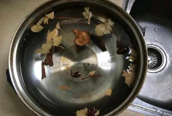 鍋洗幹凈加入適量的水,然後加入適量的鹽,鹽可以多加一點方便入味。然後我們在鍋裡加入少量的花椒,香葉,桂皮,八角,薑片,大火燒開,用鍋鏟把鹽攪拌化。然後我們加入適量的白酒。最近把調好的醬汁放到一旁晾涼。