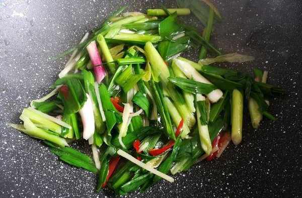 第七步:先放入香蒜的根部大火翻炒熟透,再放入葉子部分翻炒斷生。