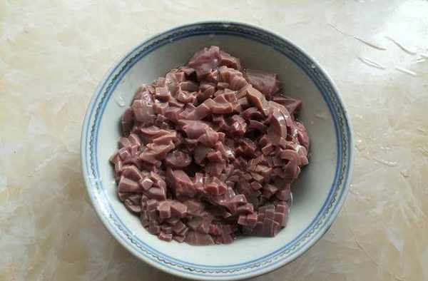 第二步:豬腰子先切花刀,再切成小塊,加高度白酒和鹽醃制10分鐘。豬腰子切花刀後面焯水容易熟透。