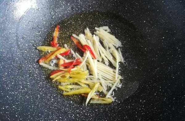 第六步:大火燒熱油鍋,放入薑絲和泡椒,翻炒出香味。