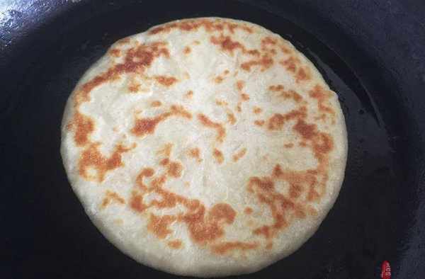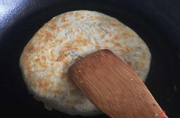 13、平底鍋燒熱,放入一點點油,把小餅放入,中小火,烙至兩面金黃就可以出鍋瞭。