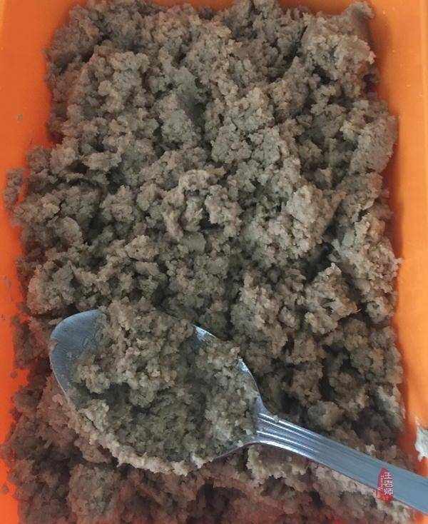 10、這是從冰箱取出來的綠豆餡料,用小勺攪拌一下,別有成團的冰渣。