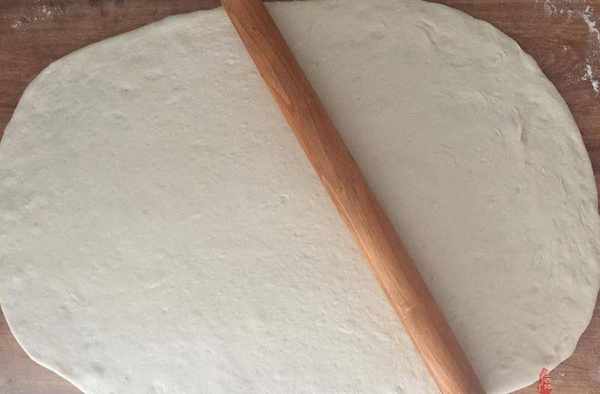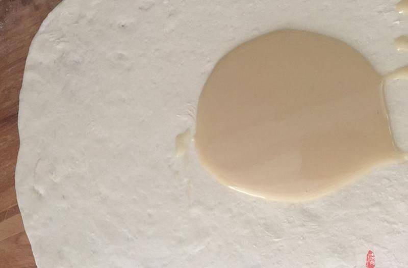 5、將基礎發酵好的面團揉至光滑後,再松弛十分鐘左右。把面團搟成橢圓形面片。