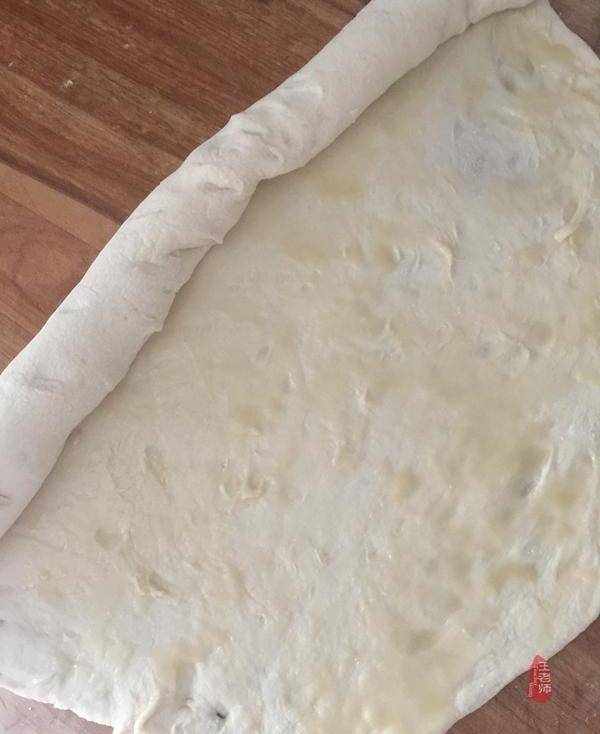 6、在面團表面均勻的鋪上油酥,撒一點點幹面粉。由一側的長邊卷起,成圓柱體。