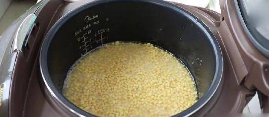 2、泡好之後直接把綠豆倒進電飯煲裡面,加入少量水,把綠豆煮熟
