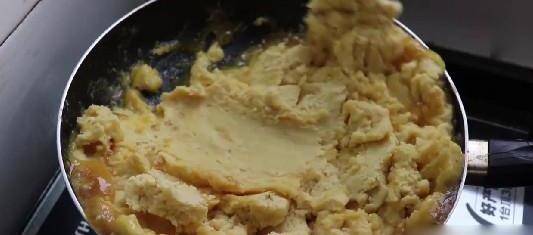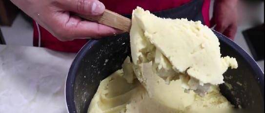 6、把綠豆泥倒入鍋中,用勺子抹開填平,一直炒到綠豆泥裡面沒有水分,完全不粘鍋就可以瞭