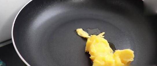 4、在鍋裡放進黃油(可以用食物油代替),把黃油煮熟化開