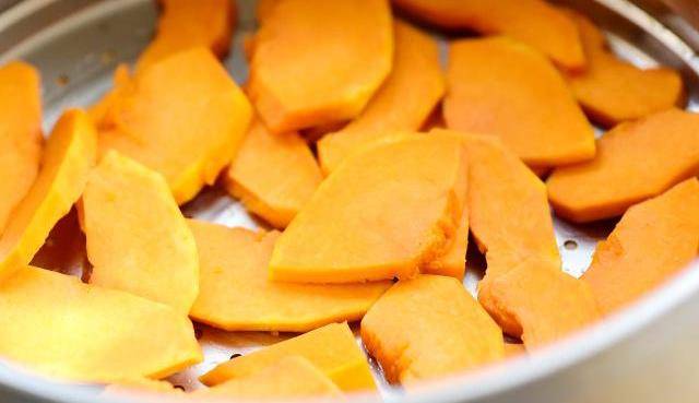 2、南瓜塊在鍋中蒸熟。
