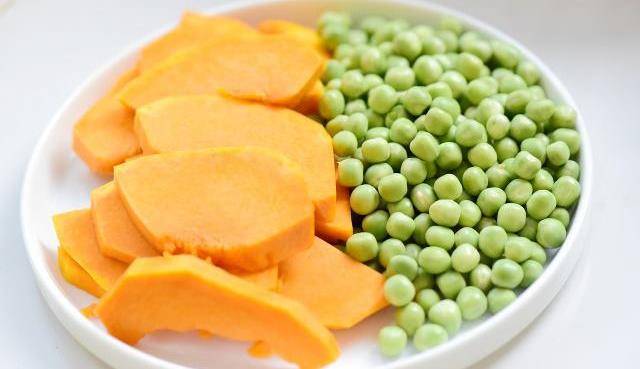 1、南瓜去皮切塊和豌豆去皮備用。