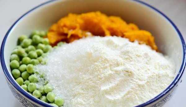 南瓜200g,豌豆250g,面粉300g,水適量,細砂糖適量