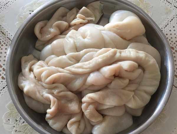 具體做法為:將我們提前準備好的豬大腸洗凈,在盆中加入2大勺食用鹽並倒入適量的料酒,不停用手揉搓10分鐘左右,再將它整個翻面,重復同一步驟,最後用清水沖洗幹凈。