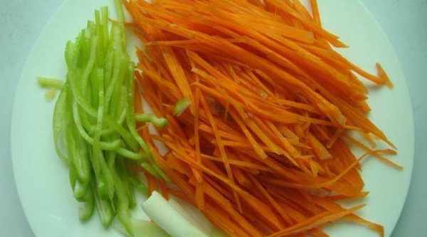 第二步:把胡蘿卜,青椒,薑,蒜,香菜洗幹凈。然後把胡蘿卜切成片,香菜切成沫,蔥花也切成沫,幹辣椒,青椒要切成段,薑要切成絲,接著在拿出一個幹凈的小碗,放入適當的淀粉,接著在放入水,用筷子,或者勺子攪拌一下,調成水淀粉。