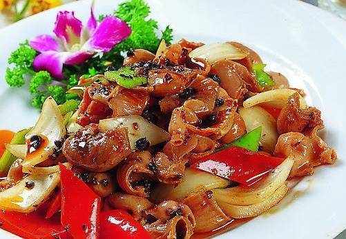 黑椒炒回魚肚:黑椒炒回魚肚是以魚肚、黑胡椒、紅尖椒、綠尖椒為主要食材制作而成的一道菜品,屬於傢常菜,輔料主要包括蔥、薑、蒜、大料等調味品。該款菜品具有養血止血、補腎固精等功效。感覺隻要吃到這道美食,就什麼煩惱都沒有瞭。