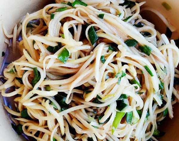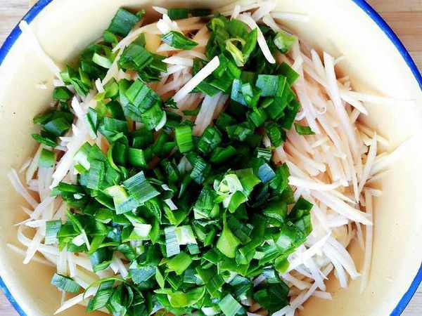 發面的時間準備土豆絲陷,將兩個清洗幹凈的土豆去除外皮以後擦成細絲,土豆絲不用在清水中浸泡;韭菜切成小碎段。