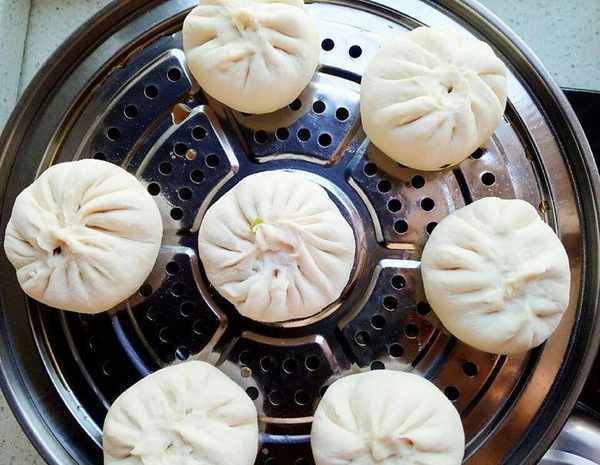 將土豆絲放入包子皮,捏住面皮的邊緣,一點一點邊褶邊捏在一起,邊提拉邊捏,邊捏邊轉,直至把整個邊都捏在一起,一個圓圓的漂亮包子就包好瞭;用同樣的方法逐個把所有的包子全部包完,在蒸屜上薄薄的抹一層油,然後將包子均勻的放在上面,註意包子之間的間隔要稍微大一點,避免二次發酵粘在一起,然後放入蒸鍋二次醒發20分鐘;我傢的蒸鍋是雙層的,我做的這些剛好可以包二層;