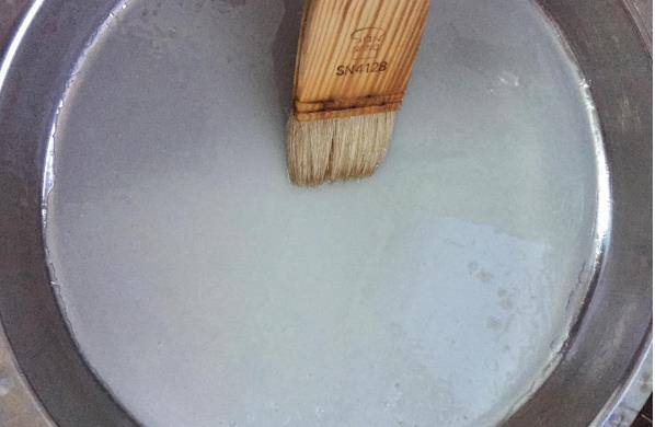 4、在平鍋中刷入一層油,不要刷得太多,如果太多米皮容易幹裂,然後再舀上兩勺米醬,他在平鍋中燒開水,將米漿放入鍋中蒸三分鐘左右。蒸熟大米,蒸熟的米皮會鼓起大泡這樣比較容易被揭下來。