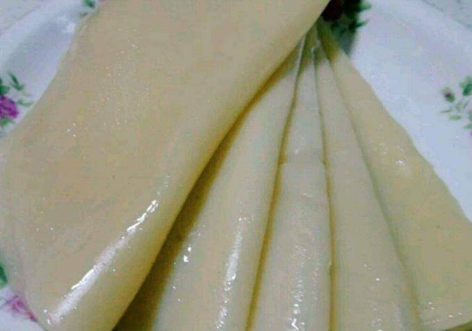 5、將蒸熟的米皮放在冷水中冷卻一會兒,在米皮上再次刷上一層油,繼續來烙第2張,再將磨好的米皮,切成條狀備用。