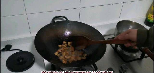 3、中火把水燒幹,然後轉小火慢慢熬油,熬油的過程當中一定要每隔一點時間就翻炒一下肉片,避免粘鍋變糊。