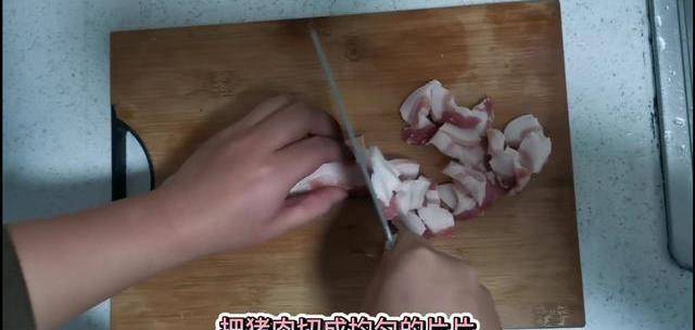 1、把肥豬肉洗凈,切成均勻的薄片,一定要均勻哦。