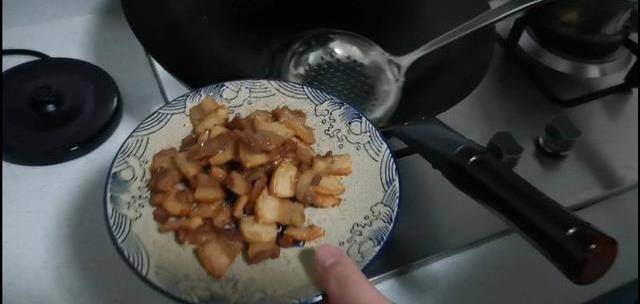 4、我們熬到肉片不在縮小的時候,就說明這個豬油已經熬好瞭,這個時候我們撈出油渣,挑出薑片。