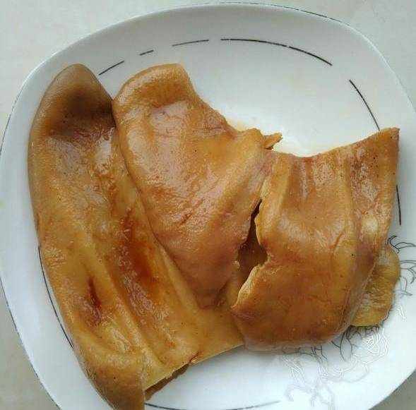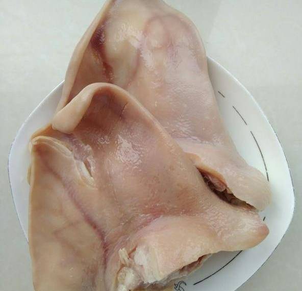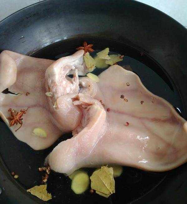 豬耳朵2個、料酒1湯匙、一品鮮醬油2湯匙、老抽1/2湯匙、精鹽適量、白胡椒粉3茶匙、五香粉3茶匙、花椒粒一小把、八角2顆、香葉幾片、桂皮1塊、薑5克