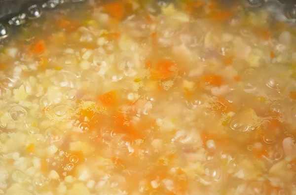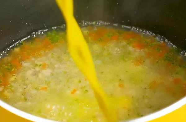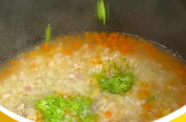 5、西蘭花碎和蛋黃液也一並倒入鍋中翻滾。