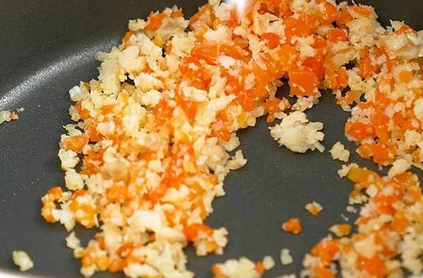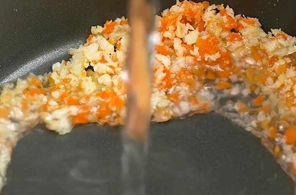 3、鍋中倒油,放入胡蘿卜和鱈魚翻炒,加適量熱水。