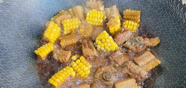 翻炒均勻之後,必須加入開水,否則肉質容易發柴,放入開水後,把玉米下鍋,放少許的鹽味精雞精調味,中火燉上20分鐘,最後大火把湯汁收至粘稠,就可以出鍋吃瞭,營養豐富又好吃,常吃順利平安過冬天。