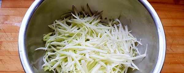 白蘿卜清洗幹凈,削皮切成細絲,切的越細越好,然後把它放在盆中,放上一勺白醋,一勺白糖,放少量的溫開水,把調料化開,