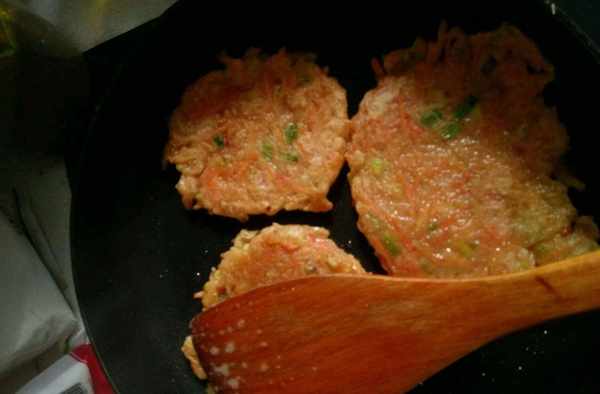(6)平鍋放油,用勺子挖一勺放在鍋內,用勺子輕輕的團成圓形;