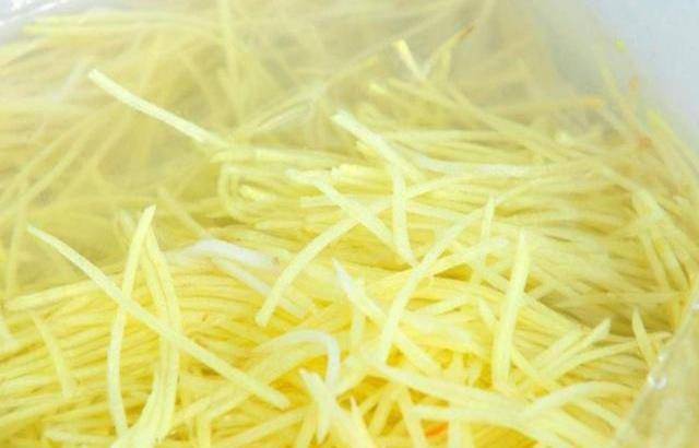 2.土豆削去皮,清洗幹凈之後,然後切成土豆絲。