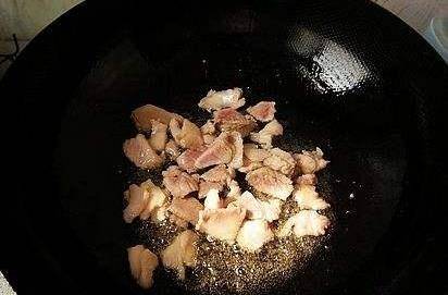 4.炒鍋燒熱之後,然後放入適量的食用油,當油溫達到六七成熱的時候,放入切好的豬肉絲煸炒至兩面金黃,然後再放入香菇幹。